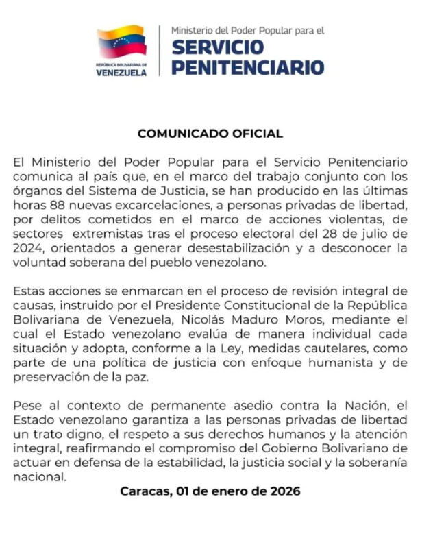 Según el comunicado oficial emitido este 1 de enero de 2026, la medida responde a un proceso de revisión integral de causas ordenado por el Ejecutivo Nacional.