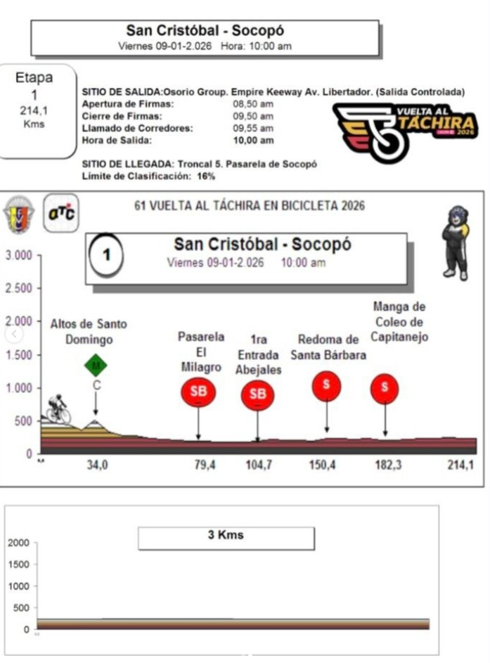 Hoy arranca la @vueltaltachira 2026 com un recorrido desde San Cristóbal a Socopó de 214,1 kilómetros que repartirán 5 premios importantes: