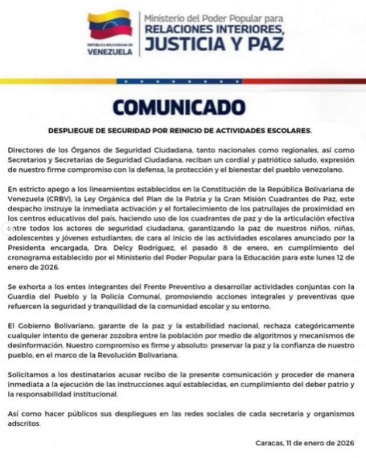 Caracas, 12 de enero de 2026 — En el marco del reinicio del año escolar 2026, anunciado por la Presidenta Encargada, Dra. Delcy Rodríguez, el Ministerio del Poder Popular para Relaciones Interiores, Justicia y Paz emitió una instrucción nacional para garantizar la seguridad integral de la comunidad educativa en todo el territorio venezolano.