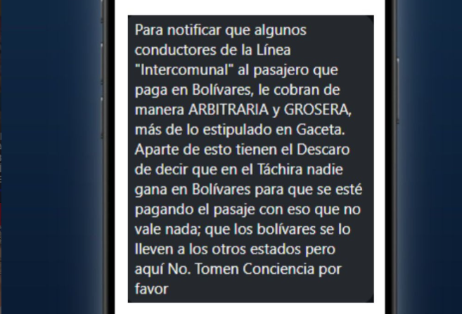 A nuestra mensajería directa, uno de nuestros usuarios hizo un llamado público para denunciar el cobro abusivo y arbitrario que algunos conductores de la Línea Intercomunal están imponiendo a los pasajeros que pagan su pasaje en bolívares.