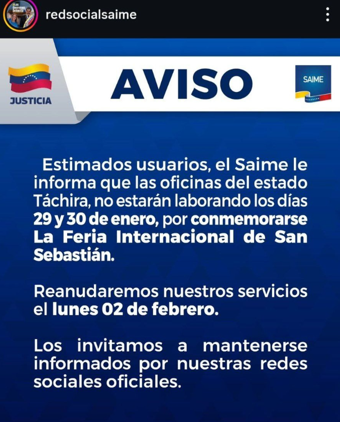 El SAIME informó a todos sus usuarios que las oficinas en el estado Táchira no prestarán servicio comercial los días 29 y 30 de enero, con motivo de la celebración de la Feria Internacional de San Sebastián.