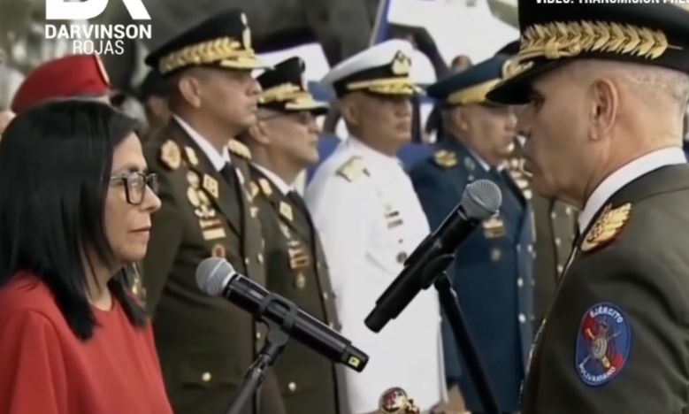 En un acto protocolar celebrado en el patio de la Academia Militar de Fuerte Tiuna, la presidenta (E) Delcy Rodríguez recibió el bastón de mando de la Fuerza Armada Nacional Bolivariana (FANB).