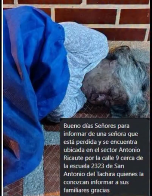 Se busca localizar a los familiares de una señora que se encuentra desorientada y perdida en el sector Antonio Ricaute, cerca de la calle 9 y la escuela E.B. “2323”, en San Antonio del Táchira.