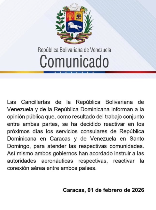 Las cancillerías de Venezuela y República Dominicana anunciaron la reactivación de sus servicios consulares en Caracas y Santo Domingo para fortalecer la atención ciudadana, así lo informó el canciller venezolano Yván Gil, en su canal de Telegram.