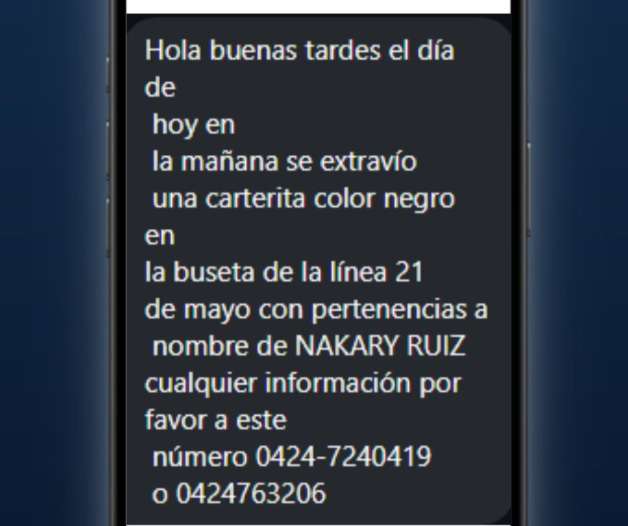 San Cristóbal, Táchira — La ciudadana Nakary Ruiz reportó este domingo la pérdida de una cartera pequeña de color negro en una unidad de la línea 21 de Mayo, durante la mañana de hoy.