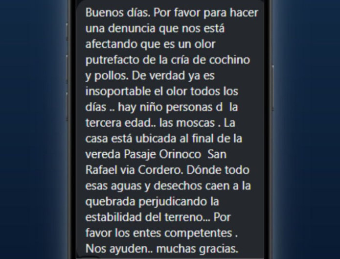 Vecinos del Pasaje Orinoco, San Rafael, en la vía hacia Cordero, alzaron su voz para denunciar la contaminación ambiental y el riesgo sanitario causado por una cría informal de cerdos y aves de corral ubicada al final de la vereda.