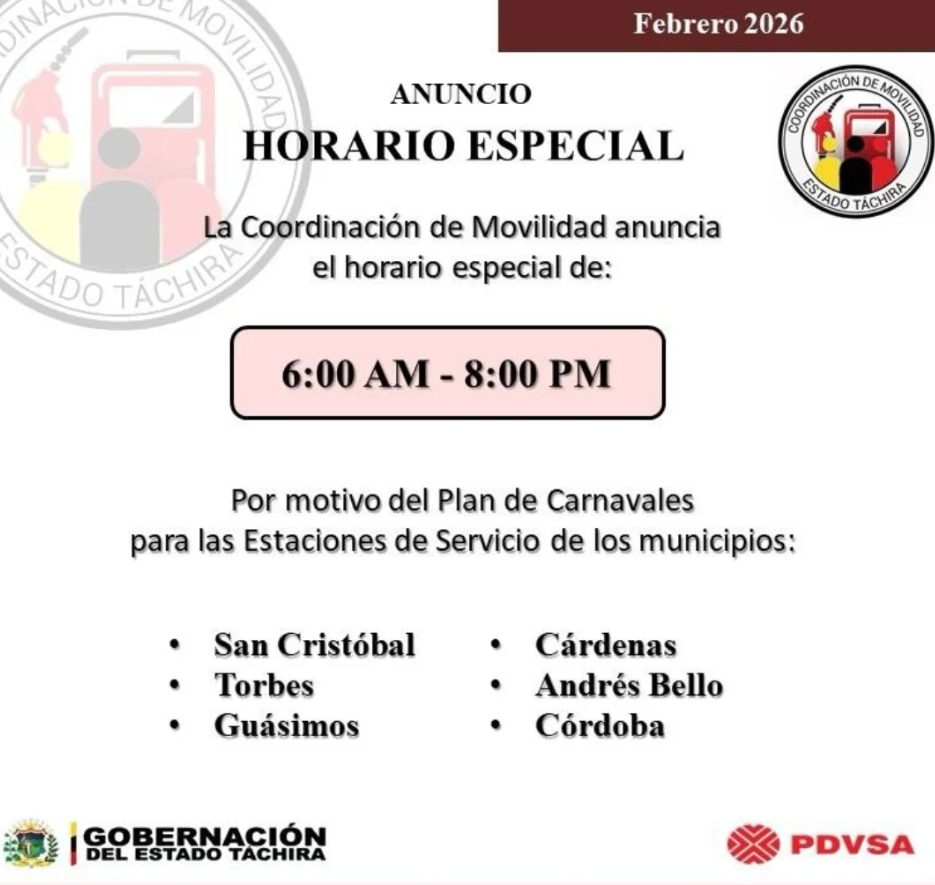 La coordinación de Movilidad del estado Táchira anunció que se realiza un Horario Especial como parte del Plan Carnaval, el horario para surtir combustible se extiende hasta las 8 de la noche, en las estaciones de servicio de los municipios anunciados en la imagen.