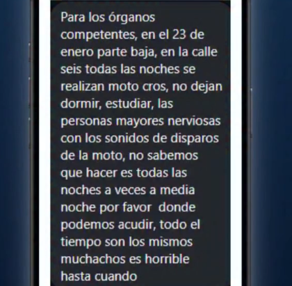 Residentes del sector Parte Baja, específicamente en la calle 6, alzaron su voz este jueves para denunciar un verdadero calvario nocturno: todas las noches, y a veces hasta pasada la medianoche, un grupo de jóvenes realiza manobras de motocross y acelerones extremos que generan ruidos similares a “disparos”, impidiendo el descanso, el estudio y afectando gravemente la salud emocional de adultos mayores.