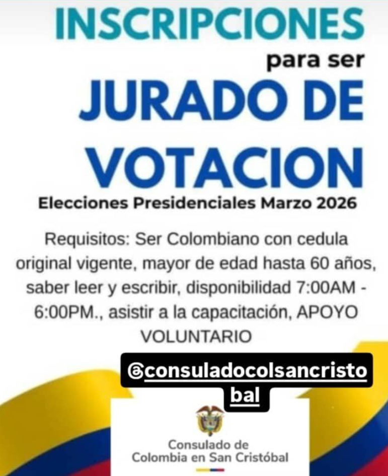 El Consulado General de Colombia en San Cristóbal, anunció la apertura de inscripciones para los connacionales interesados en participar como jurados de votación en las elecciones del Senado y la Cámara de Representantes del Congreso de Colombia, previstas para el domingo 8 de marzo de 2026, entre las 7:00 a.m. y las 5:00 p.m.