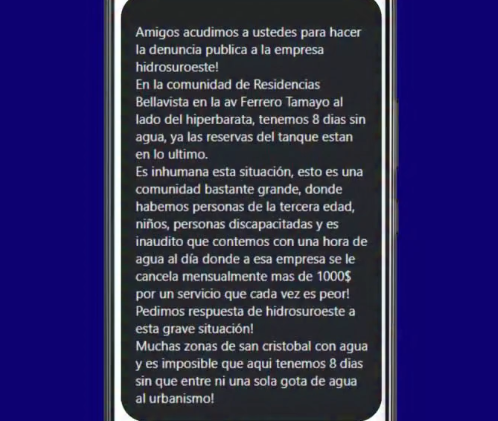 Vecinos de las Residencias Bellavista, ubicadas en la avenida Ferrero Tamayo, al lado del Hiperbarata, denuncian con indignación que llevan ocho días consecutivos sin suministro de agua potable.