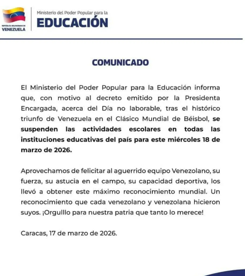 La medida responde directamente al Decreto de Día No Laborable dictado por la Presidencia Encargada, en reconocimiento al histórico título obtenido por la selección venezolana de béisbol, que se alzó con la gloria en el Clásico Mundial.