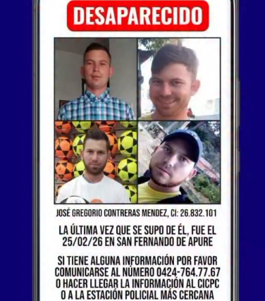 Se busca a José Gregorio Contreras Méndez (C.I. 26.832.101), quien fue visto por última vez el 25/02/2026 en San Fernando de Apure.