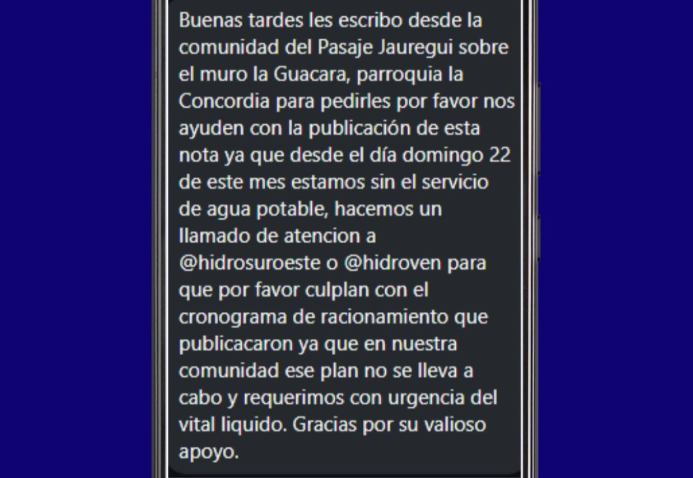 En un llamado urgente a los medios, los habitantes señalaron que, pese a que Hidrosuroeste y Hidroven han publicado cronogramas oficiales de racionamiento por sectores, en su comunidad dicho plan no se está cumpliendo: “No nos llega ni en los días programados ni fuera de ellos”, expresaron.
