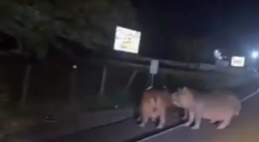 Conductores que transitaban este miércoles por la vía Medellín–Puerto Triunfo, en el sector de Hacienda Nápoles (Antioquia, Colombia), reportaron con alarma el avistamiento de una familia de hipopótamos caminando libremente sobre la calzada.