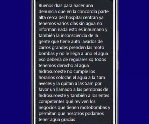 Vecinos de La Concordia, hacen un llamado urgente a las autoridades competentes y a Hidrosuroeste ante una situación crítica que afecta a los habitantes de la zona alta de La Concordia, cerca del Hospital Central: llevan varios días sin suministro de agua potable, sin previo aviso ni explicación alguna por parte de la empresa responsable.